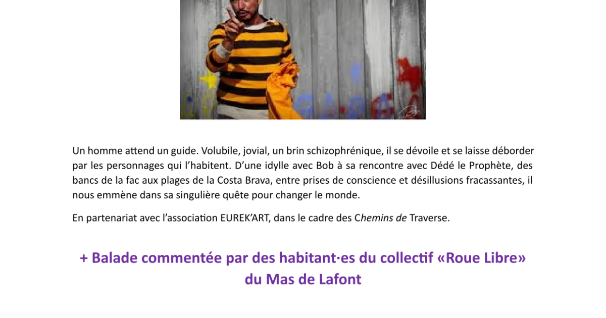 La journée se poursuit avec une balade commentée par les habitants du collectif Roue Libre à la découverte du Mas de Lafont et de ses environs, suivie d’une scène ouverte où chacun peut s’exprimer librement.
