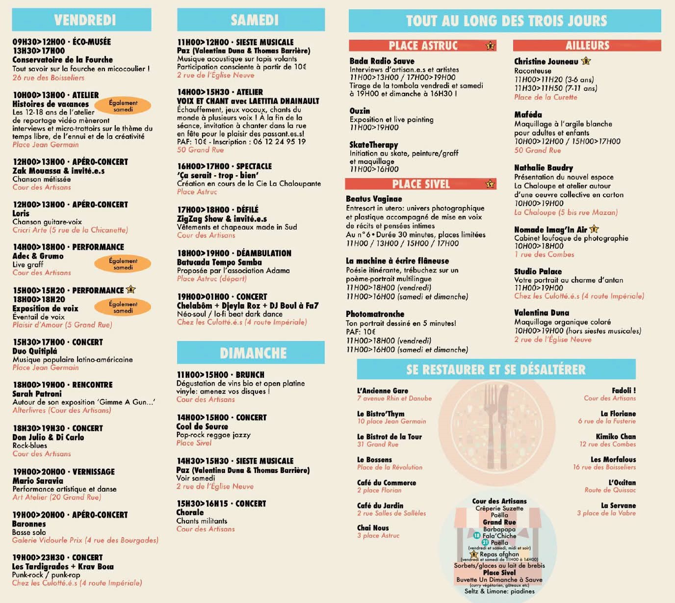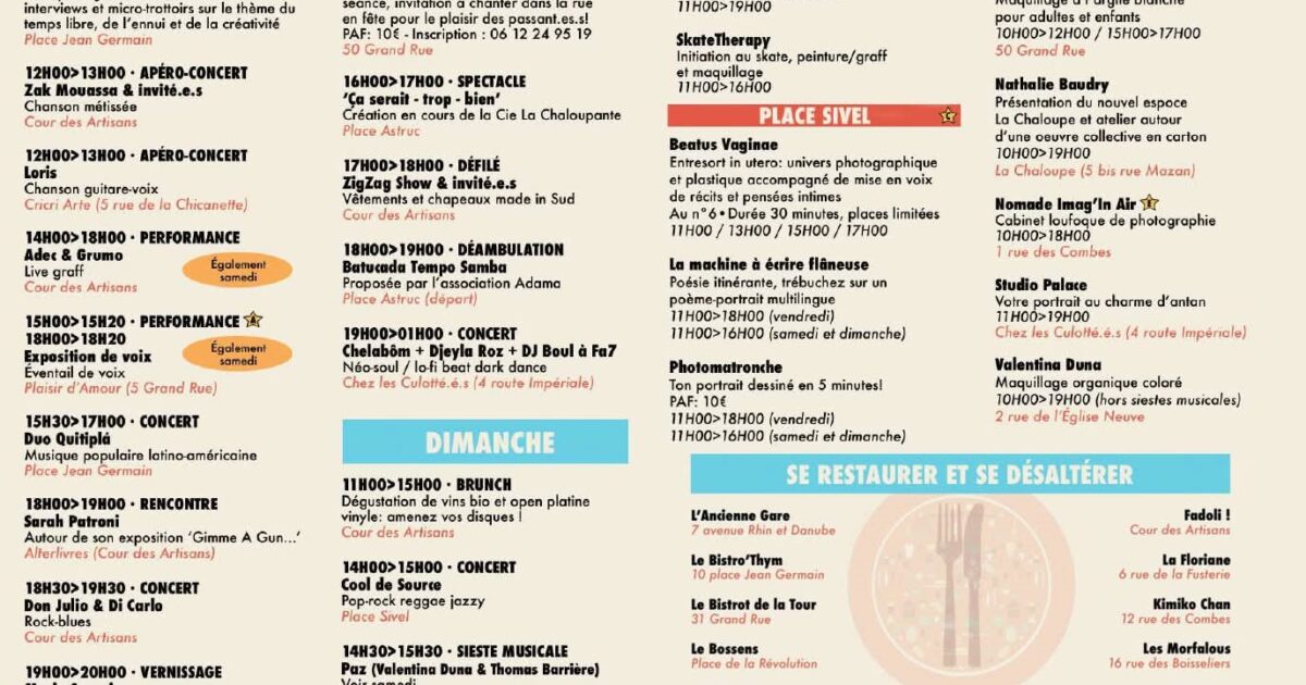 Les Ateliers ouverts, c’est aussi de nombreux spectacles, concerts et animations, du théâtre à l’exposition de voix, de la sieste musicale au portrait spontané, du défilé de créations locales à l’inauguration d’une web radio, Bada Sauve !