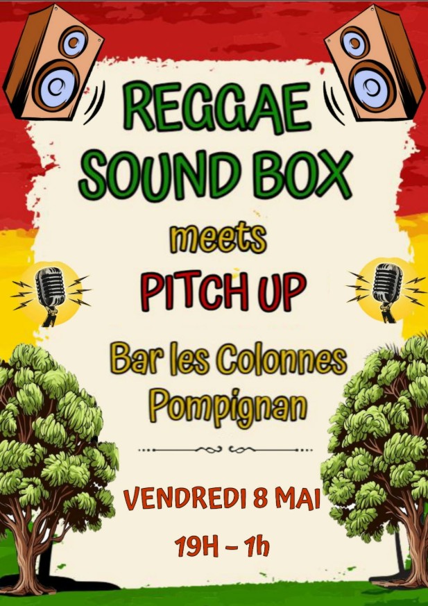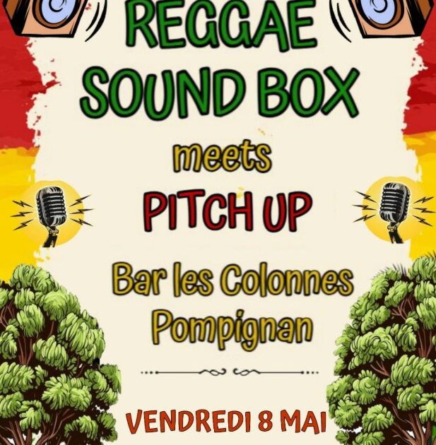 Le Bar Les Colonnes à Pompignan vibre aux couleurs du reggae le vendredi 8 mai 2026 de 19h à 1h du matin ! Au programme de cette soirée haute en couleurs : la rencontre entre Reggae Sound Box et Pitch Up, pour une nuit de sons roots, dub et bonnes vibrations.