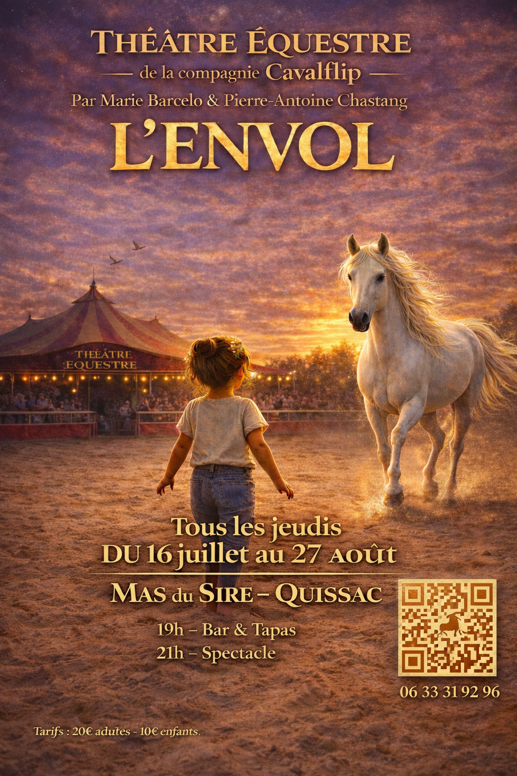Après le Cirque du Soleil et deux révélations aux Crinières d’Or, Marie Barcelo et Pierre-Antoine Chastang signent leur 9ᵉ création au Mas du Sire. Avec L’Envol, ils invitent le public à plonger dans leur univers équestre, sous un tout nouveau chapiteau