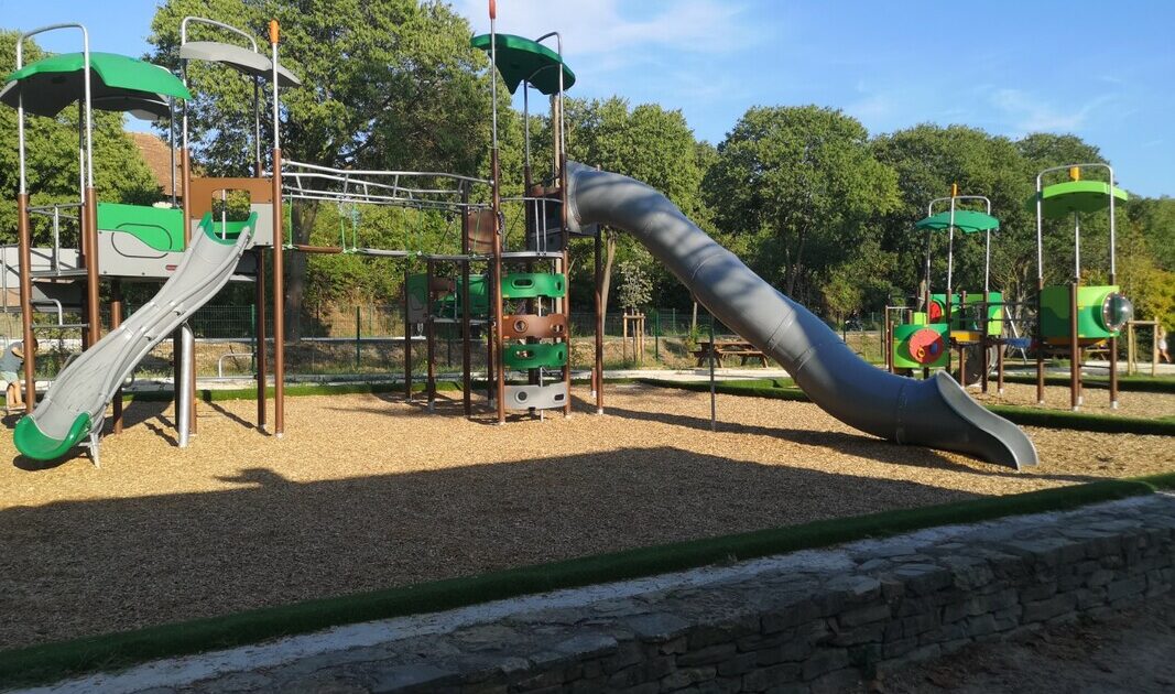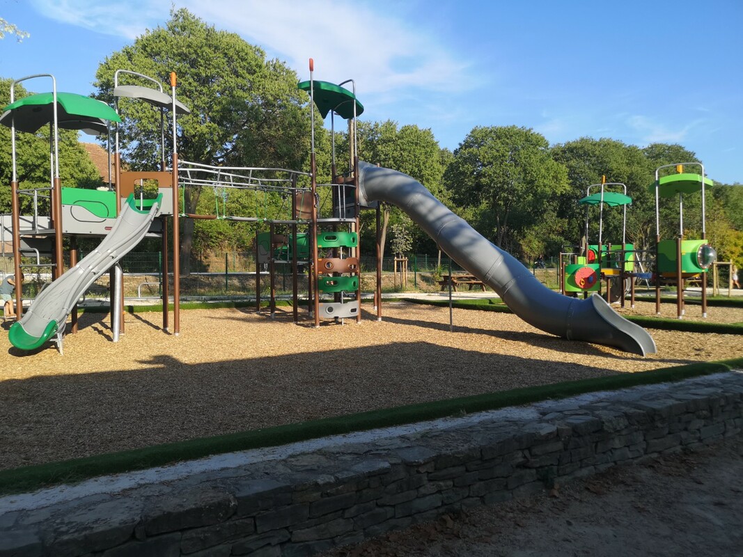Toboggan, tourniquet, petite rampe d'escalade et balançoire. Tables de pique-nique.