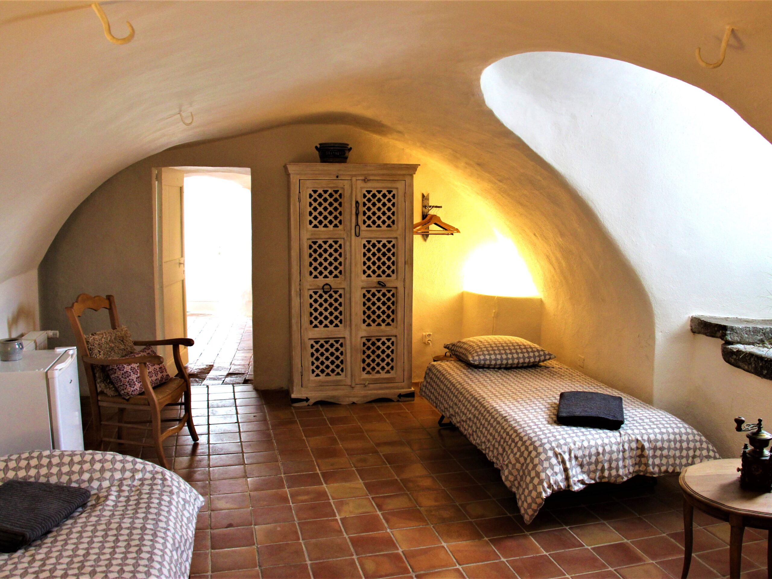La chambre d'hôtes est en réalité une suite familiale pouvant accueillir jusqu'à 4 personnes. Elle est composée d'une chambre donnant sur une terrasse, d'un salon faisant office de seconde chambre (avec petit coin pour préparer repas simples) et d'une salle de bains privative (douche et WC non séparés). Située au rez-de-chaussée, elle bénéficie d'un accès indépendant. Outre le petit déjeuner inclus, la location prévoit les lits faits à l'arrivée et le ménage de fin de séjour. La durée minimale de séjour est de 2 nuits (3 en été).