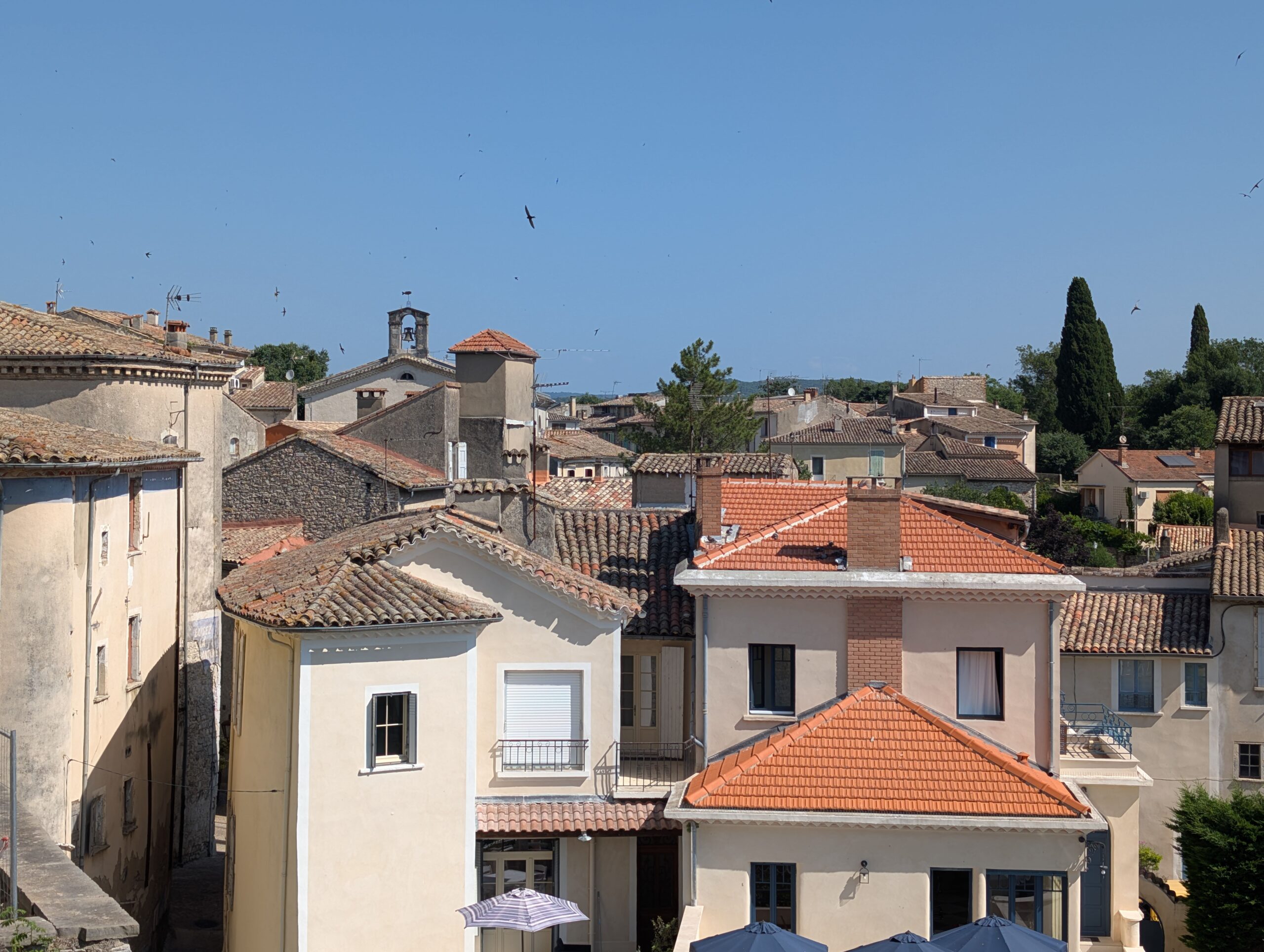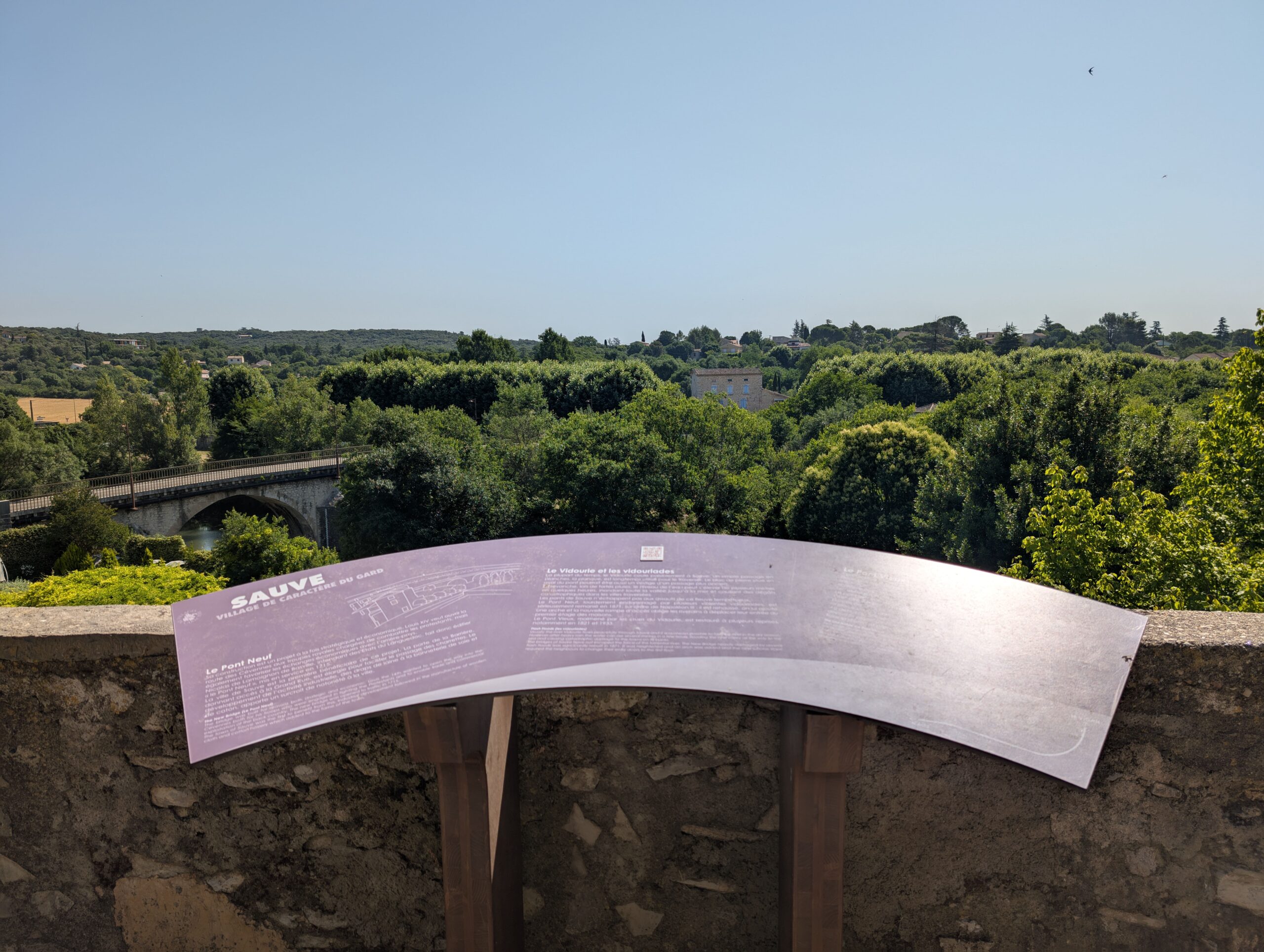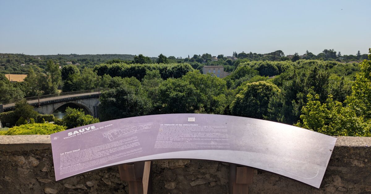 La table de lecture située sur la place Sivel de Sauve permet d'avoir une vue d'ensemble sur les ponts d'entré du village et le fleur Vidourle.